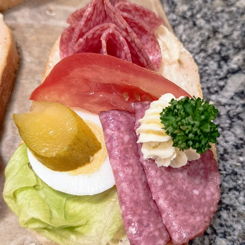 Chlebíček s poličanem – šlehané máslo poličan, vejce, majonéza, okurka